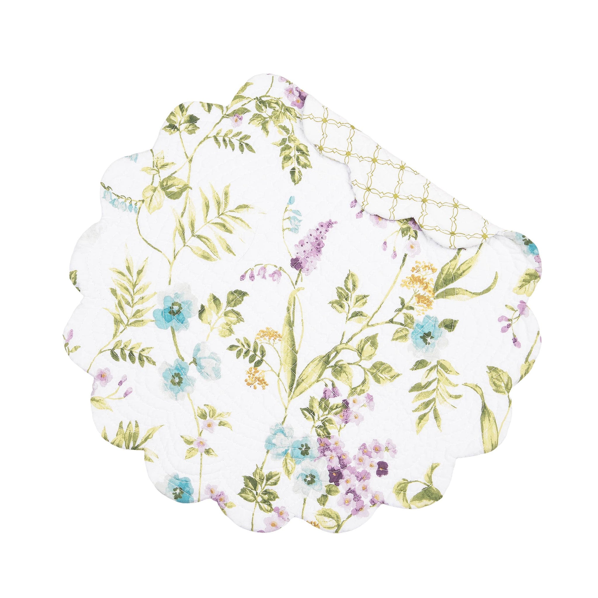 Embrace the beauty of spring all year round with the Carley placemat. The painterly flowers in a stunning array of blue, purple, and yellow on flourishing green stems evoke a sense of rejuvenation. For more styling options, these table linens reverse to a simple, yet charming yellow rosebud-style trellis pattern on a white background.