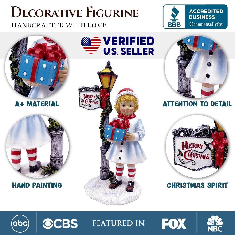 Victorian, Christmas, girl, street lamp, tabletop figurine, vintage, holiday, statue, gift, belle, 8", decor, winter, antique, collectible, traditional, festive, yuletide, nostalgic, seasonal, ornate, classic, Dickensian, handcrafted, detailed, timeless, elegant, charming, whimsical, heirloom, centerpiece, Victorian era, Victorian decor, holiday decor, old-fashioned, retro, decor